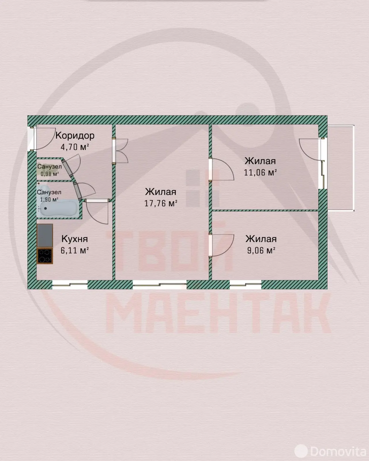 Жилая -37,85 (гостиная-17,76 кв.м, детская- 9,03 кв.м, спальня -11,06 кв.м)