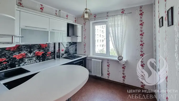 -Большая кухня (9,2 кв.м.): здесь достаточно места для комфортного приготовления пищи и размещения всей необходимой кухонной техники. В квартире остаётся встроенный мебельный кухонный гарнитур.