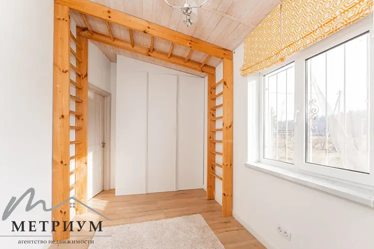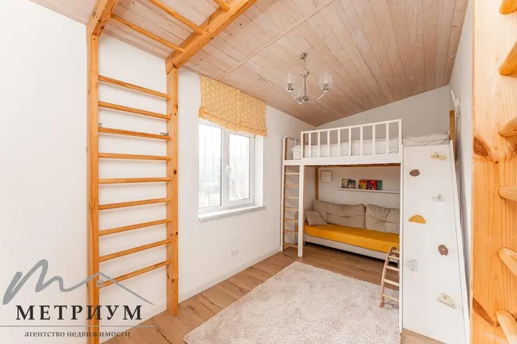 В доме 2 спальни. Детская комната с большим спальным местом на втором уровне, взобраться на которое можно по лестнице или скалодрому, а также диваном. Из главной же спальни мы попадаем на террасу 122,4м2.