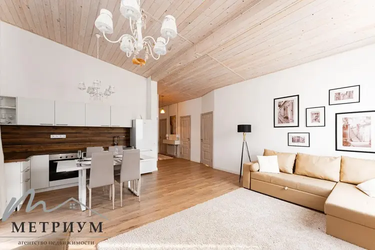 Просторная кухня-гостиная (41.7 м2), в которой расположен камин для уютных посиделок со всеми гостями и кухонная зона со всей необходимой техникой (холодильник, варочная поверхность, духовой шкаф, посудомоечная машина).