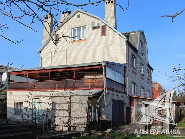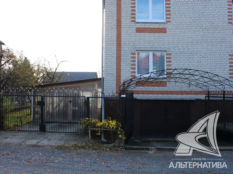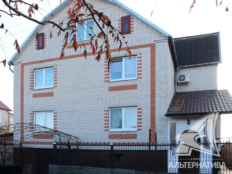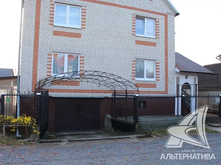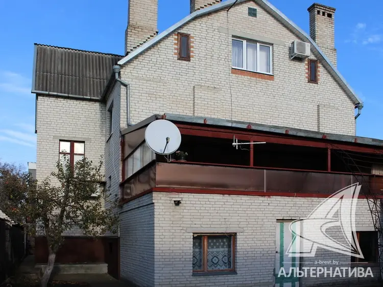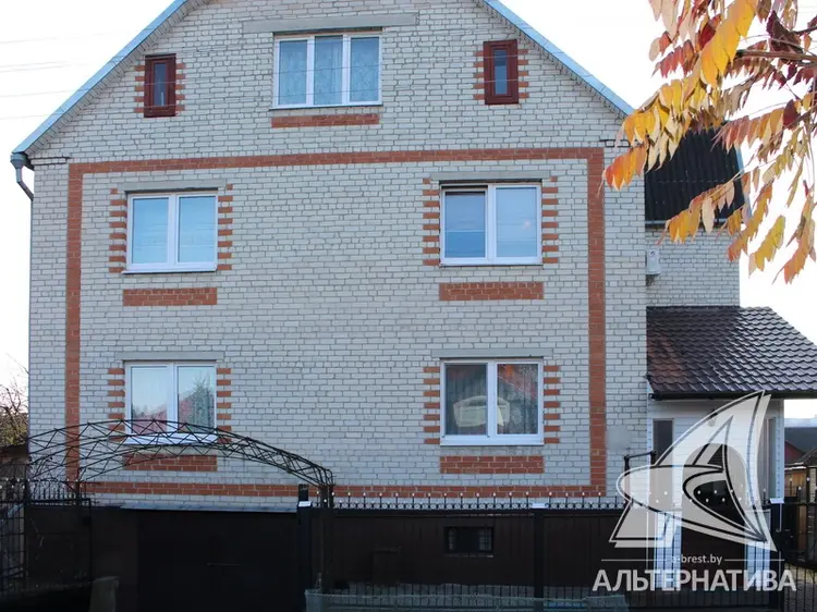 Двухэтажный жилой дом с мансардой 1998 года постройки в северо-восточной части г. Бреста. Стены коттеджа из керамического кирпича, фасад облицован; кровля - шифер. Установлены пластиковые окна из немецкого профиля КВЕ и Salamander. Общая площадь 440,2 кв.м, жилая 180,2 кв.м. Планировка разработана с учетом поквартирного разделения пространства, каждый этаж с индивидуальным входом и возможностью проживания трёх семей. По плану в доме девять жилых комнат, две кухни, несколько санузлов и вспомогательные помещения. В цокольном этаже находятся гараж на два машино-места, котельная, подвал для хранения овощей и консервации, помещение для занятия разноплановым хобби. На балконе площадью ~ 40,0 кв.м. установлено сантехническое оборудование: душевая кабина, умывальник, стиральная машина, - сушка белья осуществляется также на балконе на оцинкованных проводах (3 провода). Комнаты в жилом состоянии, для внутренней отделки использованы комбинированные материалы и деревянная вагонка. На каждом этаже есть кондиционер с функциями охлаждения и обогрева. Помещения отапливаются от нового газового котла, в качестве резервного источника тепла подключён чугунный котёл.