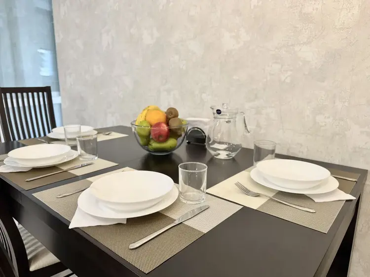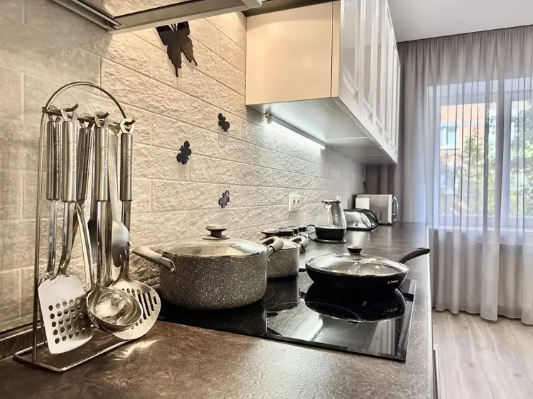 Двухкомнатные апартаменты. Апартаменты отлично подходят для командированных, туристов, семей с детьми, влюбленных пар. В апартаментах две двуспальные кровати и двуспальный диван. Вся мебель новая. На кроватях застелено свежее постельное белье. Каждому гостю предоставляется банное полотенце. В ванной комнате вы найдете фен, жидкое мыло, гель для душа, шампунь, стиральный порошок. Утром вы сможете заварить свежий кофе в кофеварке . На кухне есть кофе, сахар, соль и подсолнечное масло. В кухонном шкафчике все необходимые столовые приборы и посуда. Для приготовления пищи используйте кастрюлю, сковороду или ковш.