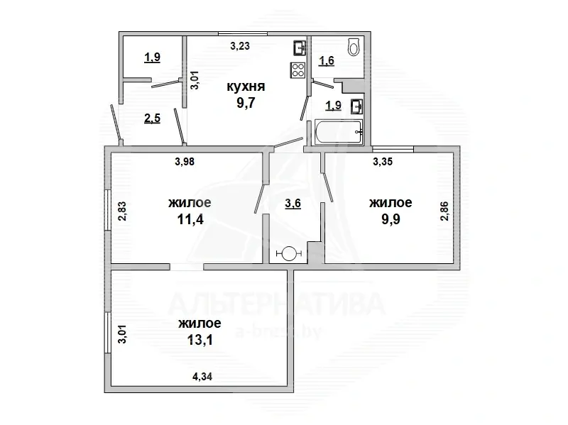 Квартира в блокированном жилом доме в г.Бресте. 1967 г.п., реконструкция 1972 г. 1 этаж. Общ.СНБ - 55,6 кв.м, общ.- 51,2 кв.м, жил.- 34,4 кв.м, кух.- 9,7 кв.м. 3 комнаты, потолки - 2,7 м.