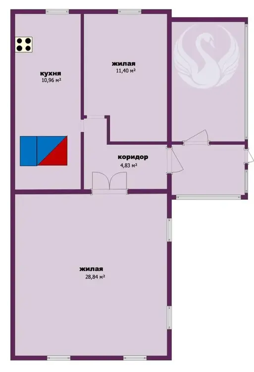 - Жилая часть дома 40м2, в которой 2 комнаты (28,84м2 и 11,40м2), кухня 10,96м2.