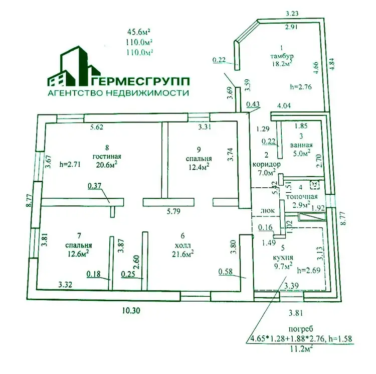 Общая площадь 110 м2, жилая 45,6 м2, кухня 9,7 м2.