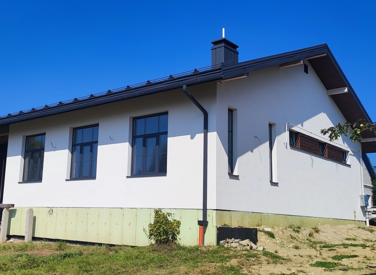 Материал стен – газосиликатный блок утеплен пенопластом. Выполнена штукатурка по всему дому и гаражу. Чистовая отделка фасада декоративной штукатуркой.