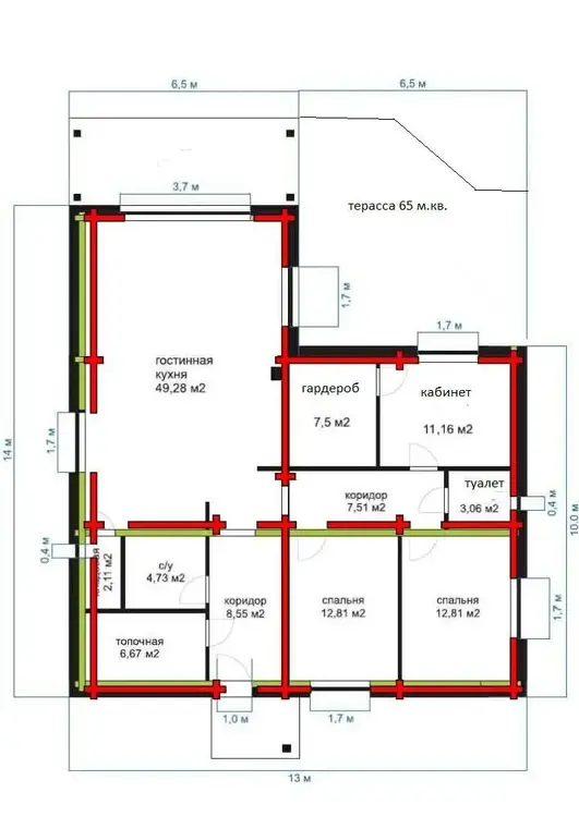 - наружные стены представляют собой каркас из профилированный бруса сосна 180/180 естественной сушки