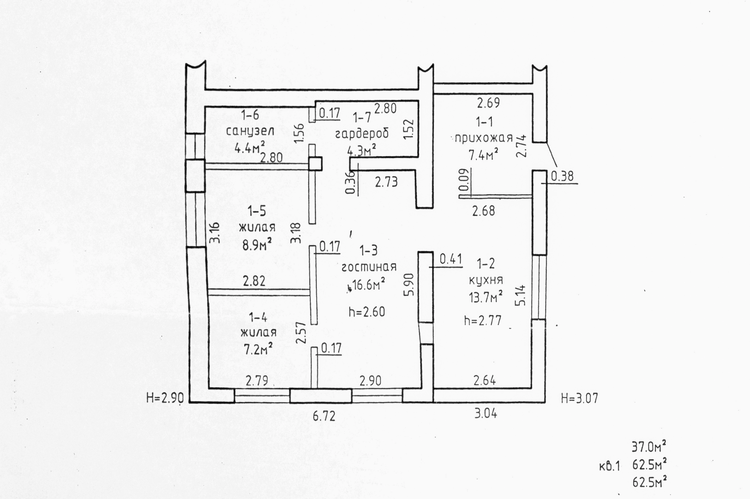 Площадь: Общая – 63 м; Жилая – 37 м; Кухня – 13.7 м; Гардеробная – 4.3 м; Санузел – 4,4 м; Прихожая – 7.4 м; Высота потолка: от H=2.6 м до H=2.77 м;