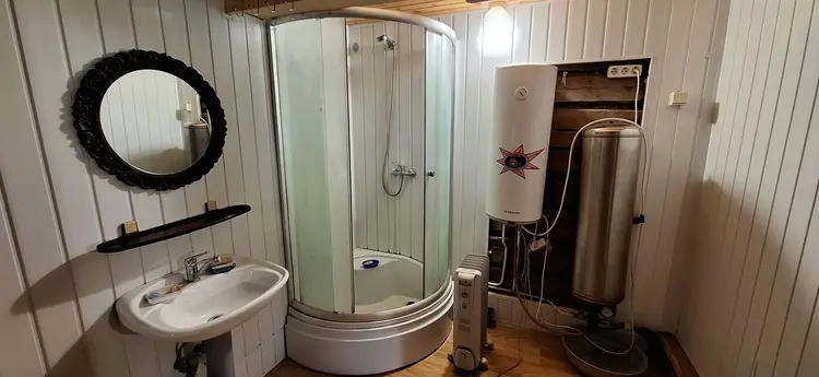 совмещенный санузел 9 м. кв., с душевой кабиной, раковиной, унитазом, бойлером. Канализация в доме местная, вода заведена в дом с колодца.
