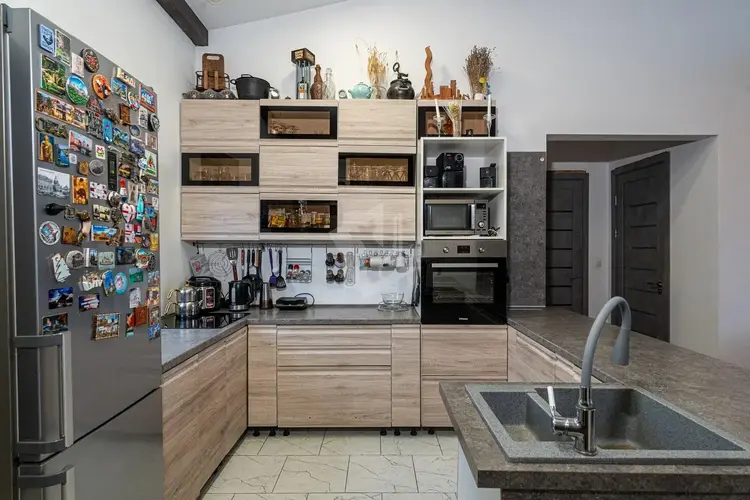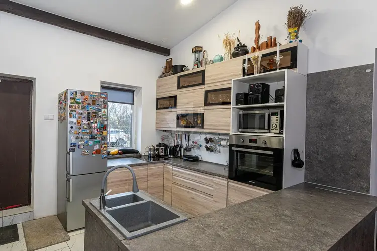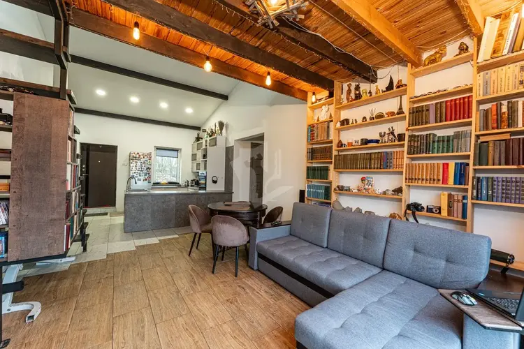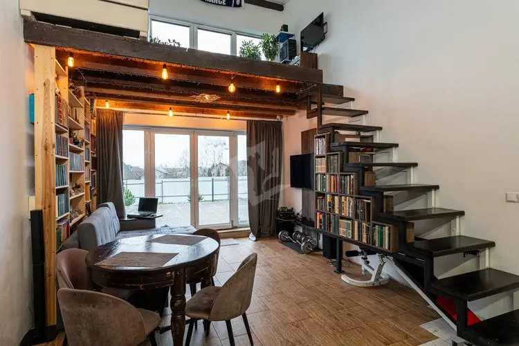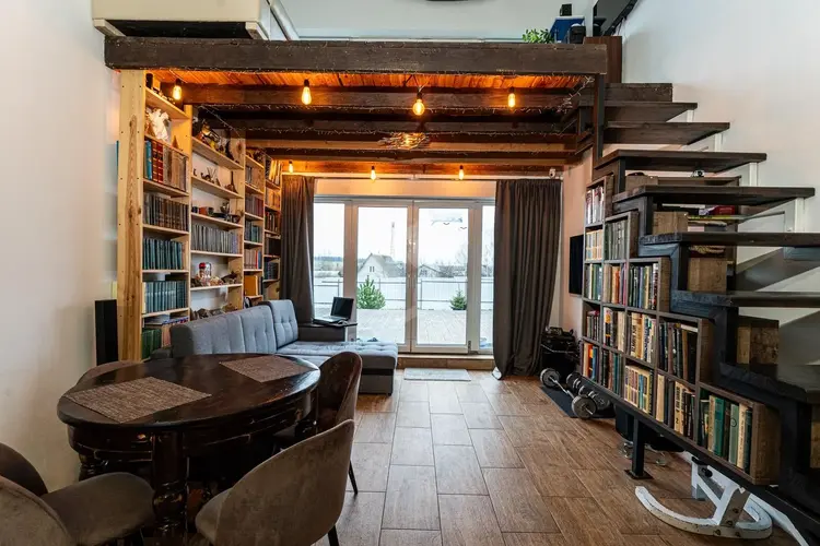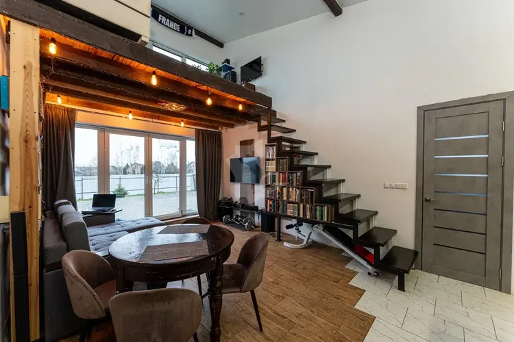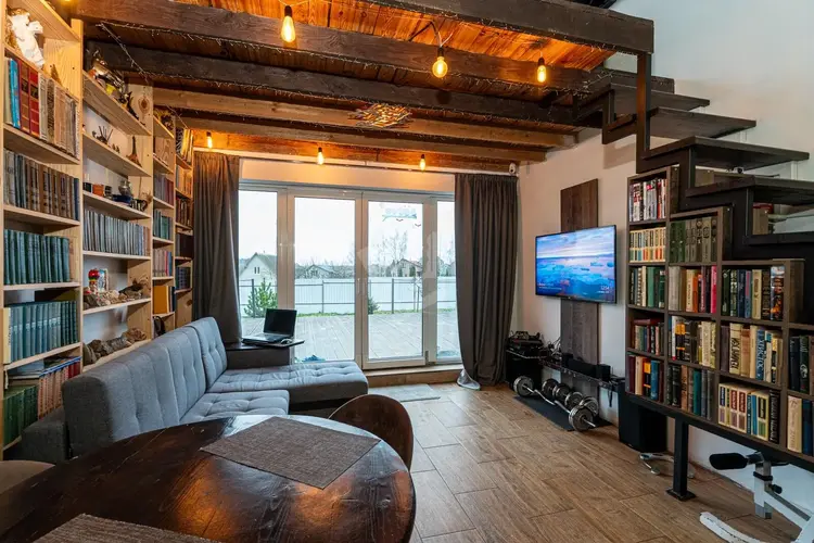- Планировка и интерьер: открытая кухня‑гостиная с кухонным островом и столовой зоной, комфортный диванный угол, рабочая зона у окна. Высокие деревянные балки и тёплый декоративный потолок создают уютный лофт‑шарм; большие панорамные двери ведут на просторную террасу. В доме продуманы места для хранения — высокие полки и книжные стеллажи по стенам, есть место под домашний кабинет