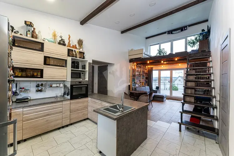 - Продаётся открытый двухуровневый дом с большой террасой и огороженным участком. Светлая гостиная с высокими деревянными балками, панорамные двери на террасу, современная кухня‑остров, место под кабинет и обширные книжные стеллажи. Подходит для постоянного проживания или творческой семьи.