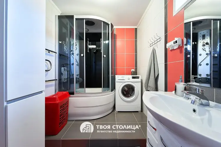 На первом уровне в зоне с/у уложена плитка с системой подогрева пола. Отопление обеспечивает двухконтурный газовый котёл Ariston. Такой формат помогает поддерживать стабильную температуру и планировать расходы.