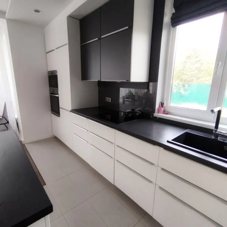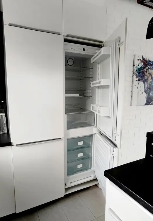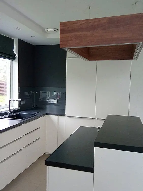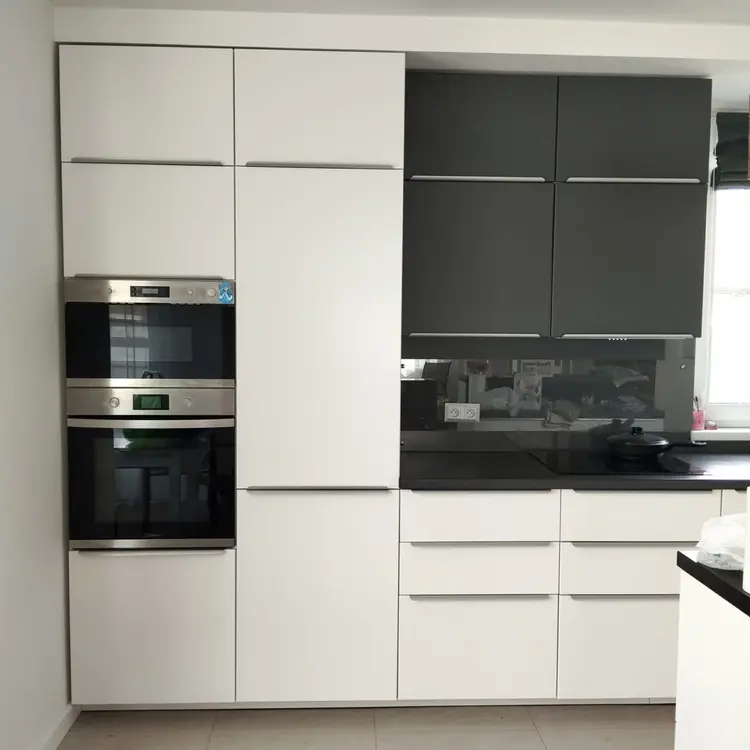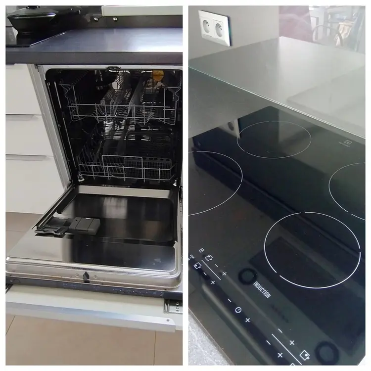 Современная встроенная кухня: индукционная плита, микроволновая печь, духовой шкаф, холодильник, посудомоечная машина, вытяжка.