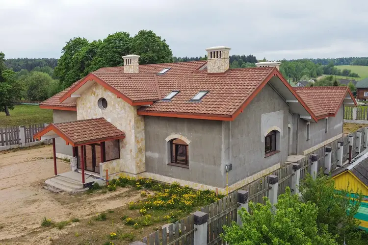 - Коттедж, выполненный в средиземноморском стиле и отделанный Бразильским кварцитом. Из красного кирпича, спроектирован и построен с сохранением климат контроля. (Стены - керамический блок, утеплитель - 100 мм; воздушная прослойка, внешняя кладка в полкирпича; общая толщина стен – 700 мм + 2см штукатурка.)
