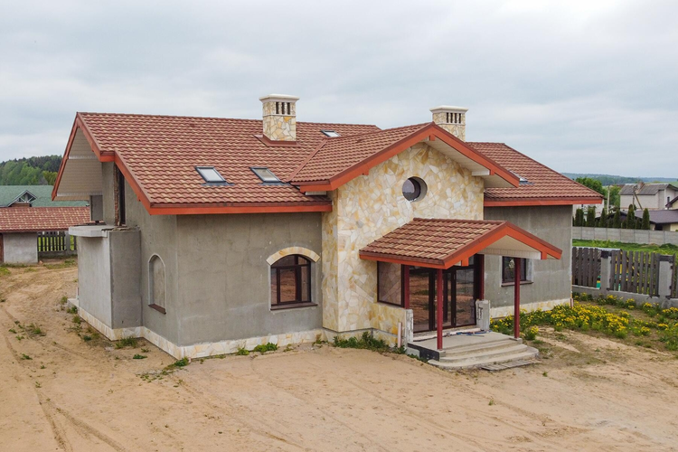 - Коттедж, выполненный в средиземноморском стиле и отделанный Бразильским кварцитом. Из красного кирпича, спроектирован и построен с сохранением климат контроля. (Стены - керамический блок, утеплитель - 100 мм; воздушная прослойка, внешняя кладка в полкирпича; общая толщина стен – 700 мм + 2см штукатурка.)
