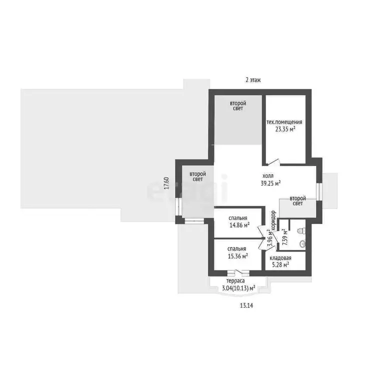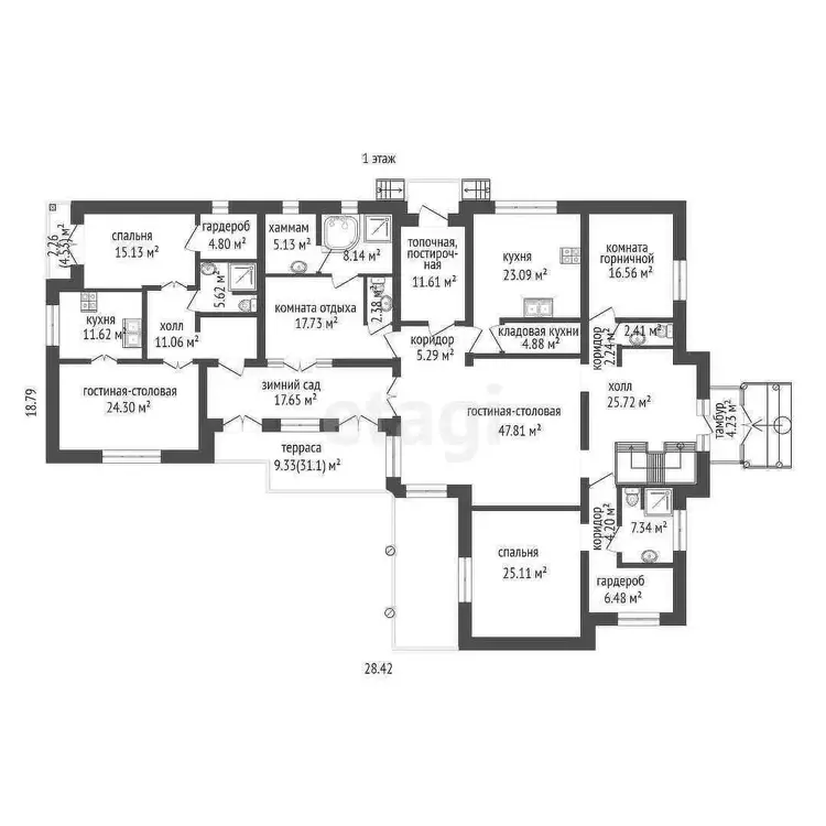 Основной жилой дом состоит из двух жилых зон (74 м2) и (379 м2), имеющих отдельные входы, и объединённых зимним садом (19 м2), из которого есть вход в спа-зону с комнатой отдыха, ванной комнатой и хаммамом (33 м2), а также выход на летнюю террасу (23 м2) с выходом во внутренний двор. Таким образом, в доме, не нарушая границ друг друга, могут жить две семьи