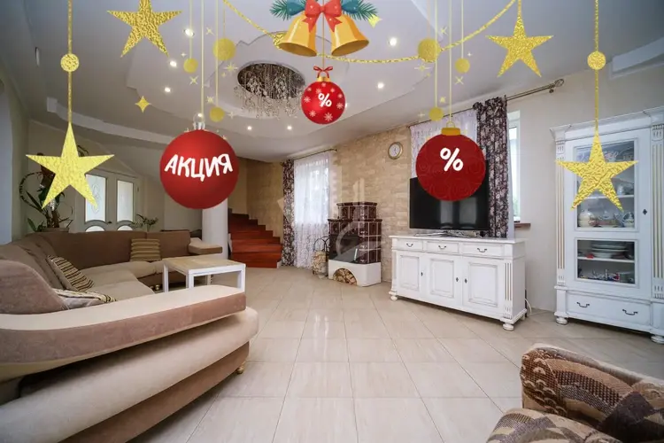 На цокольном этаже гараж с секционными воротами, бойлерная, санузел, комната для отдыха (тренажерный зал), баня (дровяная печь), душевая с бассейном (требует доработки).
