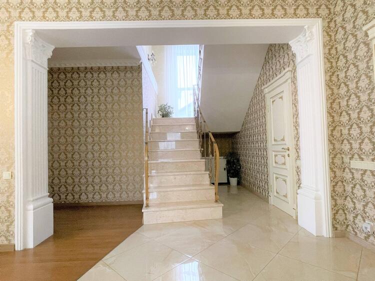 С первого на второй этаж ведёт мраморная лестница с кованными перилами.