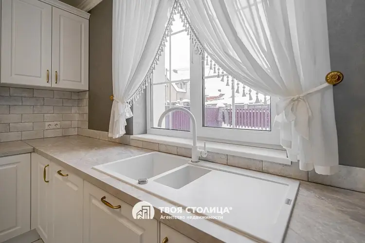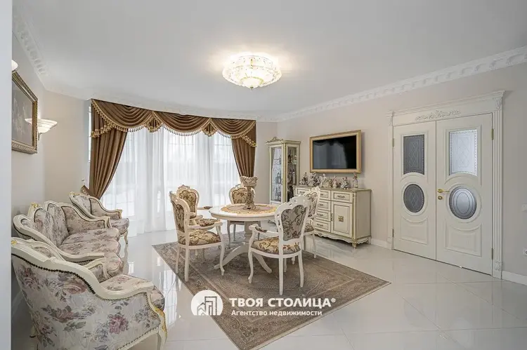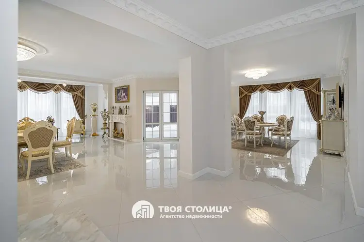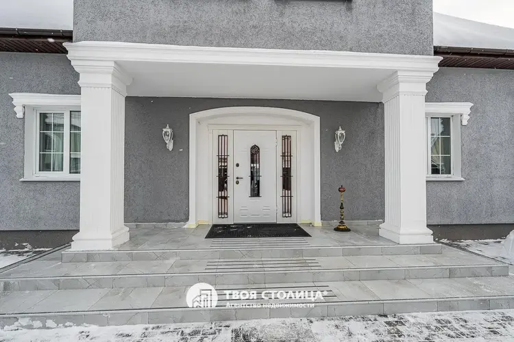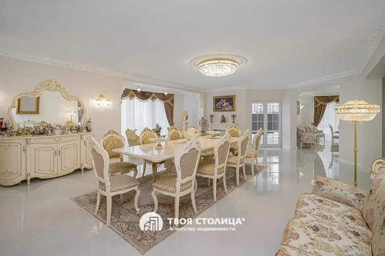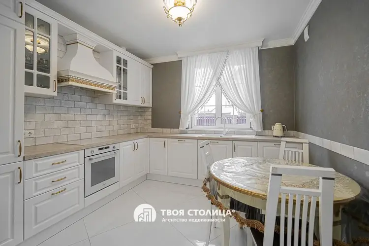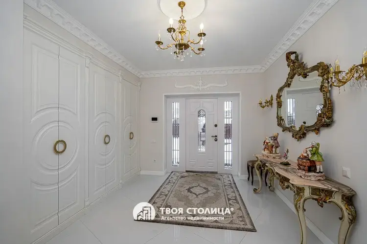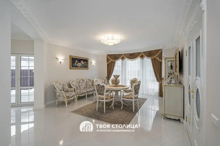 Новый комфортабельный коттедж с центральными коммуникациями. Центр престижной коттеджной застройки. Готов к проживанию. Отделка в современном стиле. Импортные качественные материалы. Высокие потолки. Комфортная планировка. Гостиная с выходом на террасу. Столовая. Камин Кухня с современной мебелью и бытовой техникой. Три изолированные спальни, каждая с отдельной смежной гардеробной. Французские окна с наружными площадками для размещения декоративных растений. Просторный холл с окном. Прачечная. Хозяйственные помещения. Три санузла. Мебель и предметы интерьера по дополнительному согласованию. Гараж на два автомобиля. Кладовая. Топочная. участок 9,15 соток. Капитальное ограждение. Мощение плиткой. Видеодомофон. Оптоволокно. Улица заасфальтирована. Установлены бордюры. Удобные заезды и выезды. Шаговая доступность остановок общественного транспорта и торговых центров. Прямая продажа ООО "Твоя столица", УНП 101136973, лицензия №02240/15 от 17.02.05г.