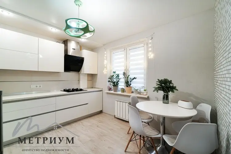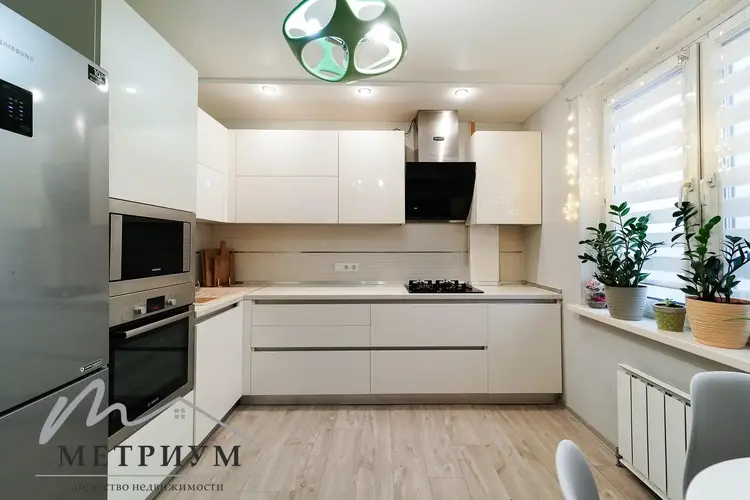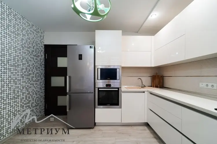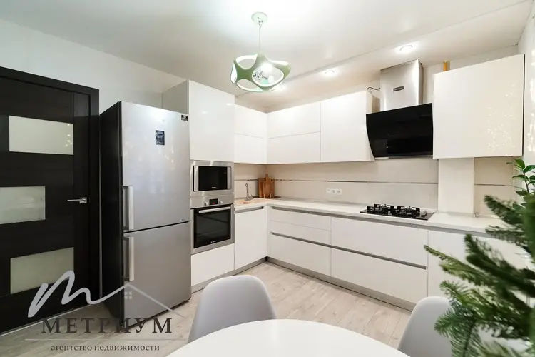 Ремонт выполнен в светлых тонах, вся мебель и техника остается. Красивый дизайнерский холодильник, итальянский духовой шкаф Электролюкс, газовая варочная панель, вытяжка.