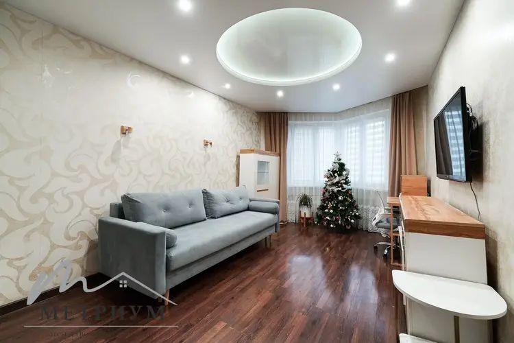 Удобная гардеробная с зеркальными дверями. В просторной жилой комнате есть ниша для зоны спальни и зона отдыха с диваном.