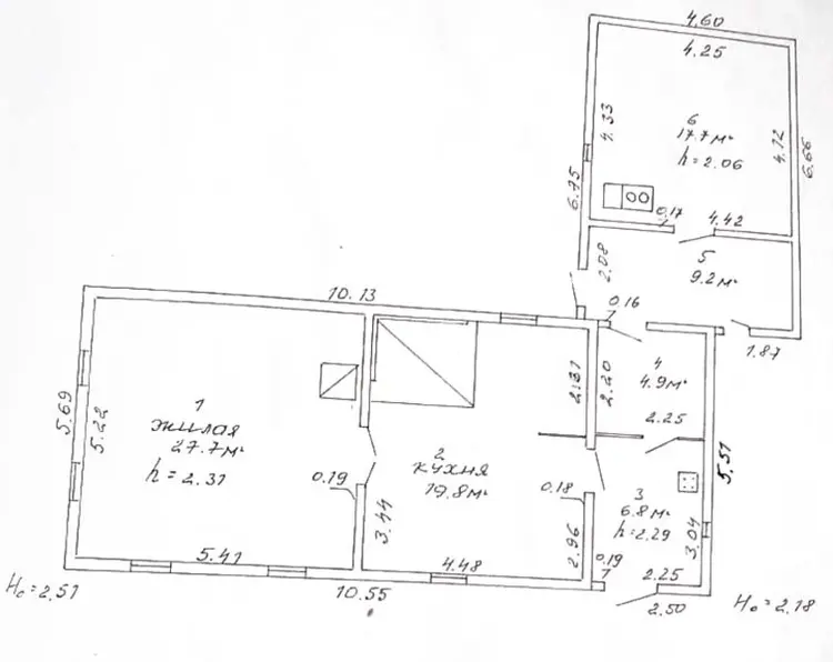 Описание: отдельно стоящий одноуровневый деревянный жилой дом, общая площадь зданий 86,1 кв. м, общая площадь жилого помещения составляет 47,5 кв. м. Жилая площадь состоит из одной большой комнаты 27,7 кв. м, кухня – 19,8 кв. м, холодной пристройки 26,9 кв. м, большая кладовая. Дом в нормальном состоянии. Входная и межкомнатные двери деревянные, окна деревянные, пол – доска, внутренняя отделка – обои. Крыша – шифер. Отопление – печное.