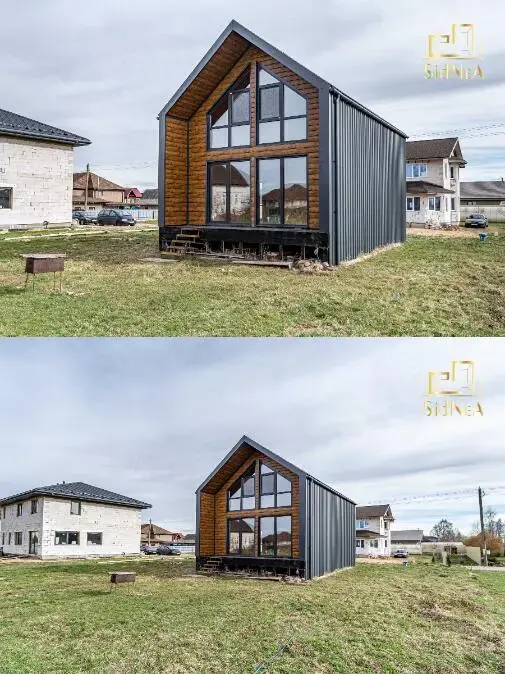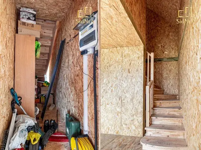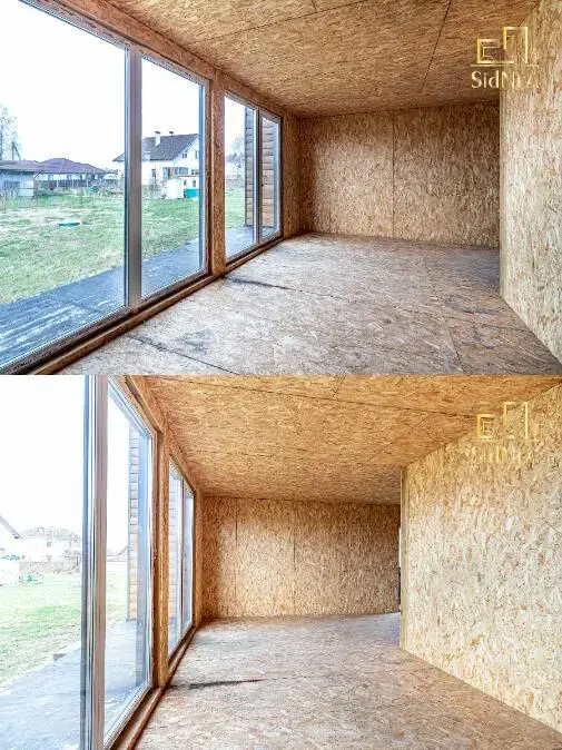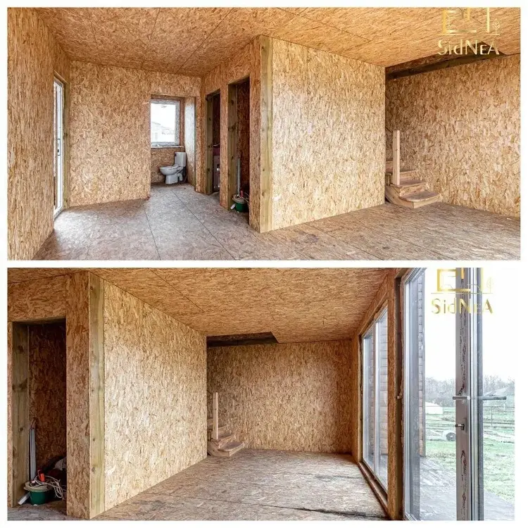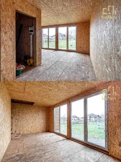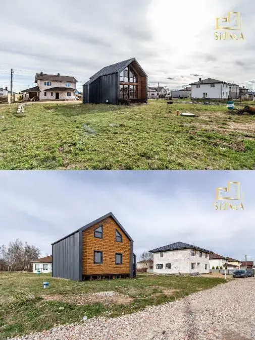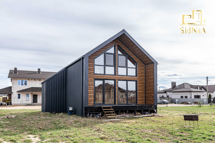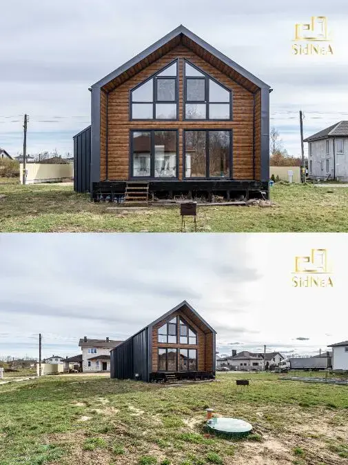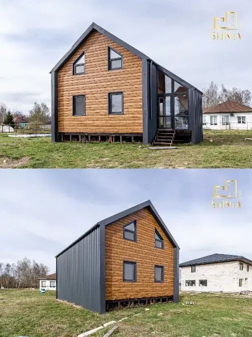Стены: СИП панели, наружная отделка металлопрофилем цвет графит и королевский дуб.