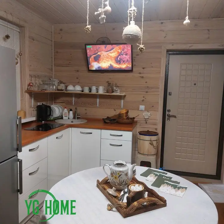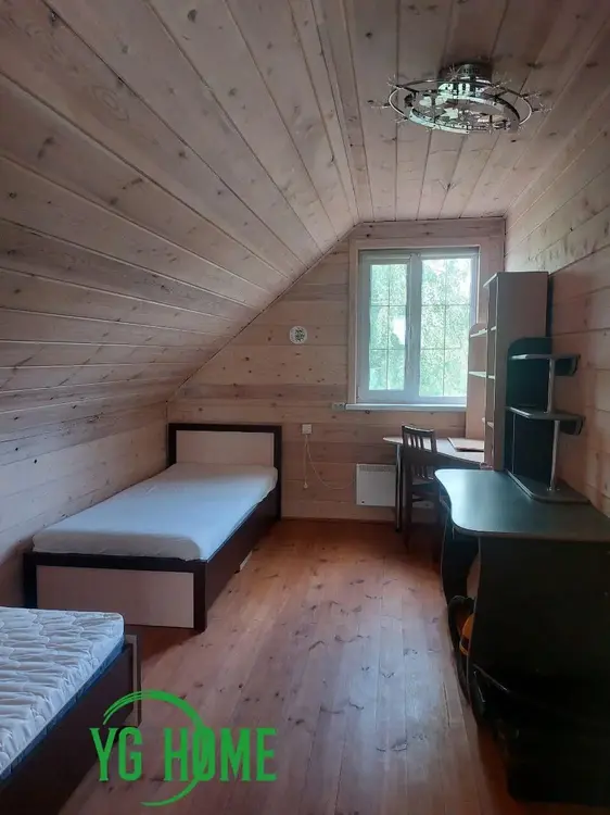 В гостевом доме на 1- м этаже общ.площадью 51м2 находится терраса 10м2, баня с большой парной ( 2.5на 3 метра), закрытой каменкой облицованной натуральным камнем змеевик, липовая вагонка и полки, вентиляция басту, гостинная, душевая и санузел. На 2-м этаже две жилые комнаты, общ площадью 50м2.