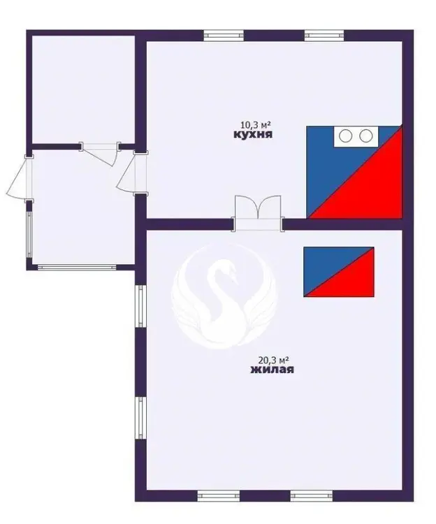 - Общая площадь дома составляет 30,6 м2, из них 20,3 м2 жилая, кухня 10,3 кв.м.