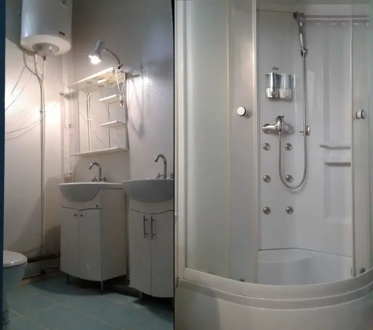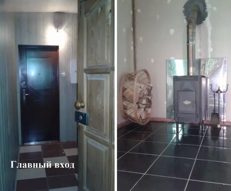 На 1 этаже кухня, санузел и большая комната с печкой. Стены отделаны гипсакартоном, пол выстелен фанерой.