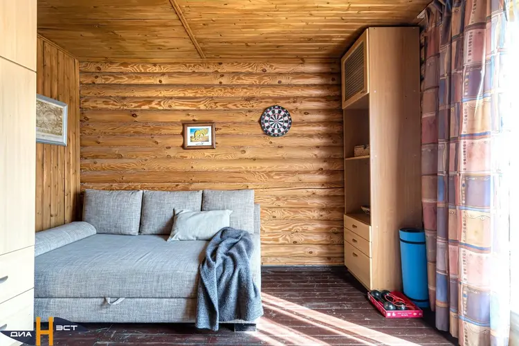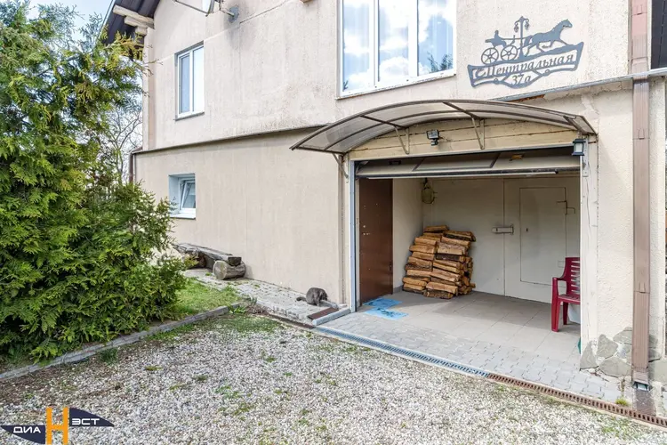 - Цокольный этаж выложен с использованием фундаментных блоков, первый и второй этажи сделаны из высококачественных оцилиндрованных бревен. Снаружи дом утеплён и оштукатурен;