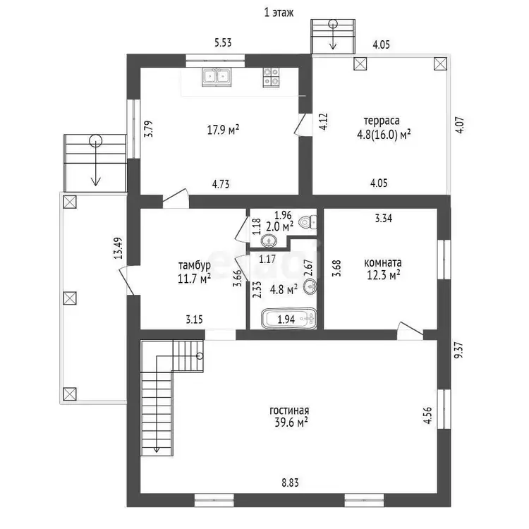 - Есть цокольная часть, общей площадью - 69,4 м2 (под авто и котельную)