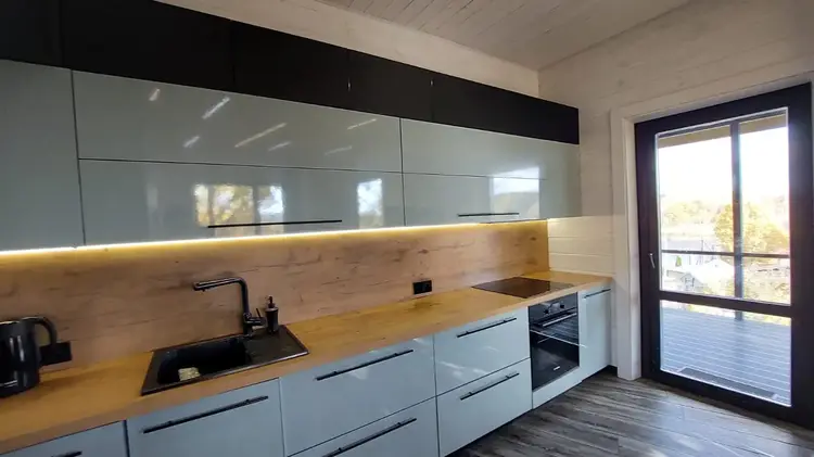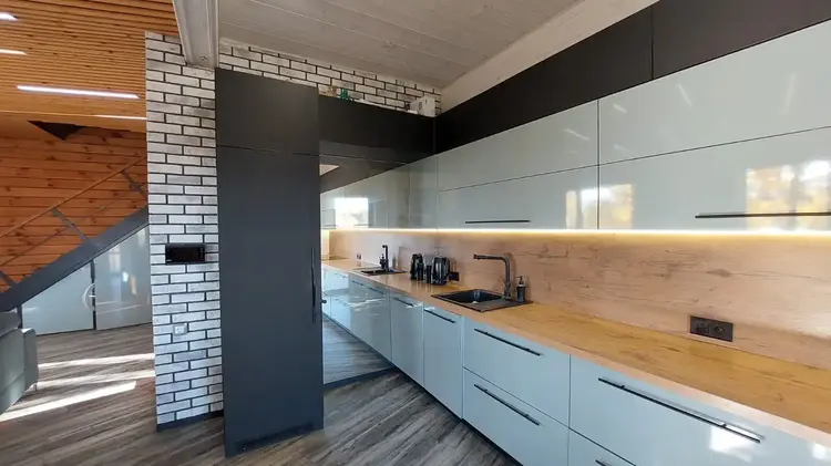 • гостиная с огромными окнами и видом на озеро. Полностью оборудованная кухня с дорогой техникой и выходом на террасу