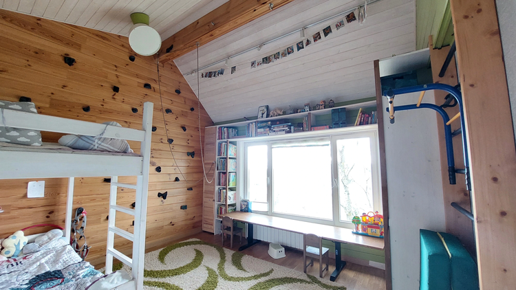 • Детская комната с двухуровневой кроватью, регулируемым по высоте столом на 2-3 детей, шкафчиками, полками. По одной стене - скалодромные захваты до 4,5м. со страховочной системой.