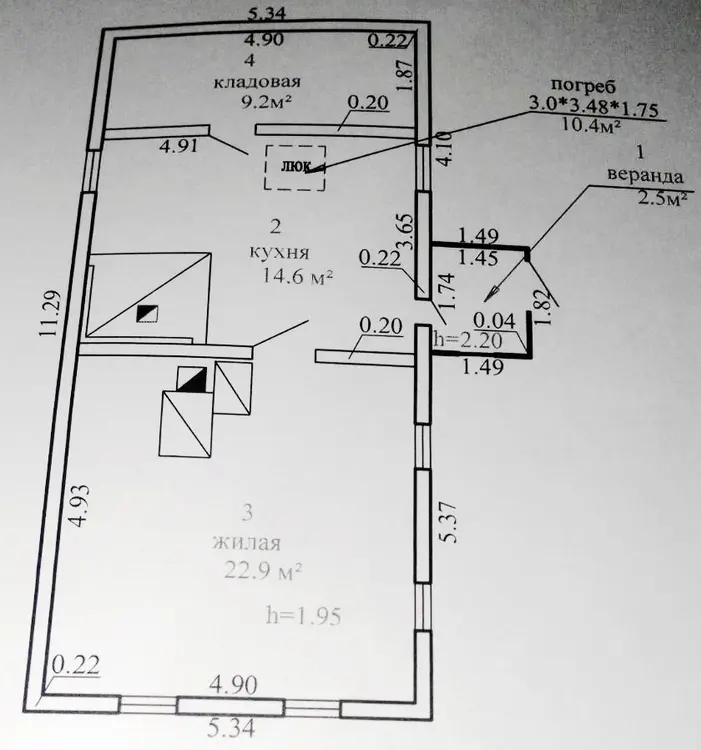 Описание: одноуровневый деревянный дом 1960 года постройки общей площадью 47.2 кв. м. Планировка включает одну большую комнату жилой площадью 22.9 кв. м и просторную кухню в 14.6 кв. м. Дом в неплохом состоянии, в нём установлены деревянные окна и двери (входная и межкомнатные), полы — дощатые, стены отделаны обоями. Крыша покрыта шифером. В доме имеется подвальное помещение.
