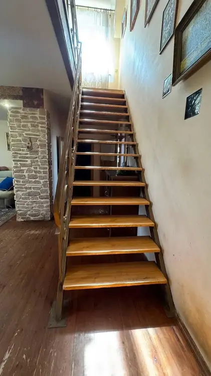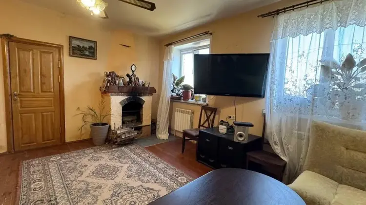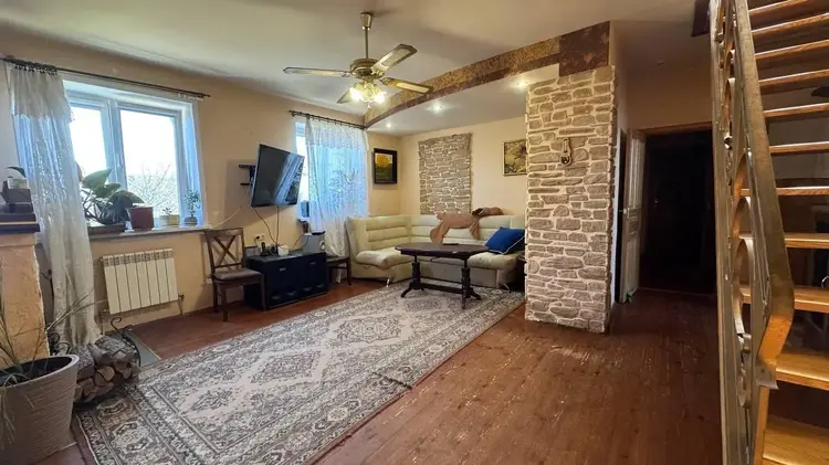 Гостиная: просторная и светлая комната с камином 29,5 кв.м., которая может служить центром семейных встреч. Лестница с элементами ковки. Двери из массива. Полы деревянные.