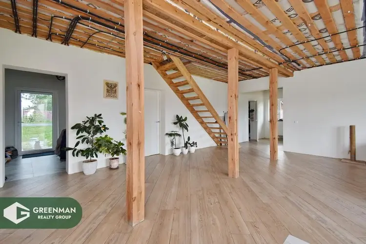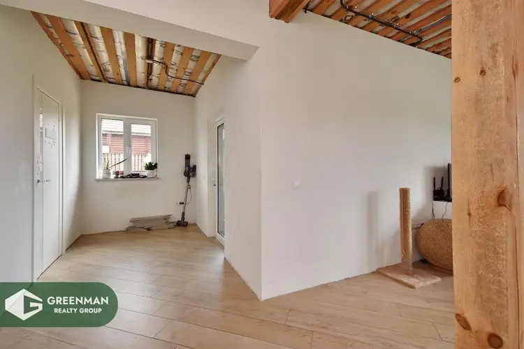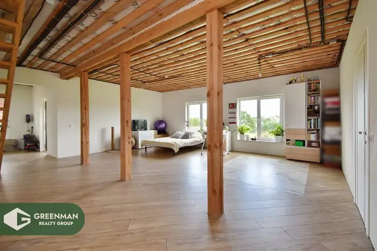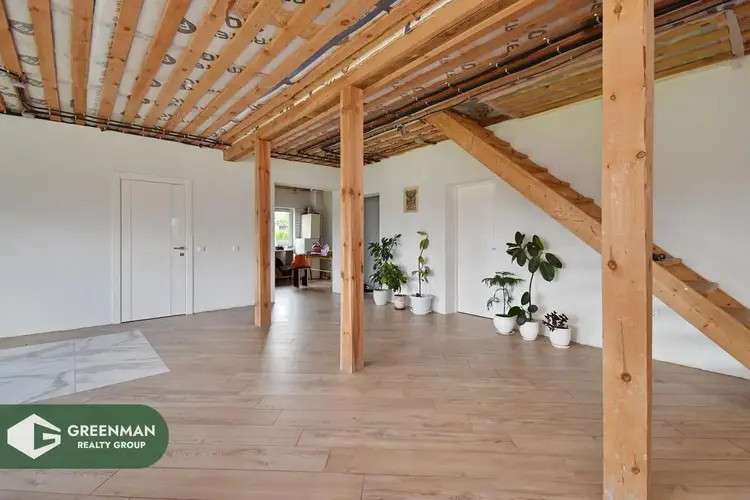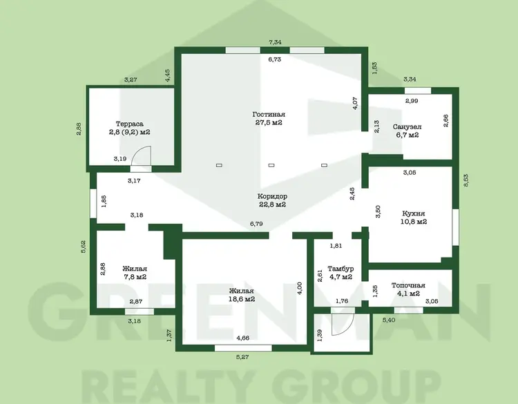 Просторная гостиная-27,5 кв.м, две жилые комнаты -18,6 кв.м. и 7,8 кв.м., кухня -10,8 кв.м., коридор -22,8 кв.м., топочная -4,1 кв.м., санузел -6,7 кв.м., тамбур- 4, 7кв.м., терраса 9,2 кв.м.