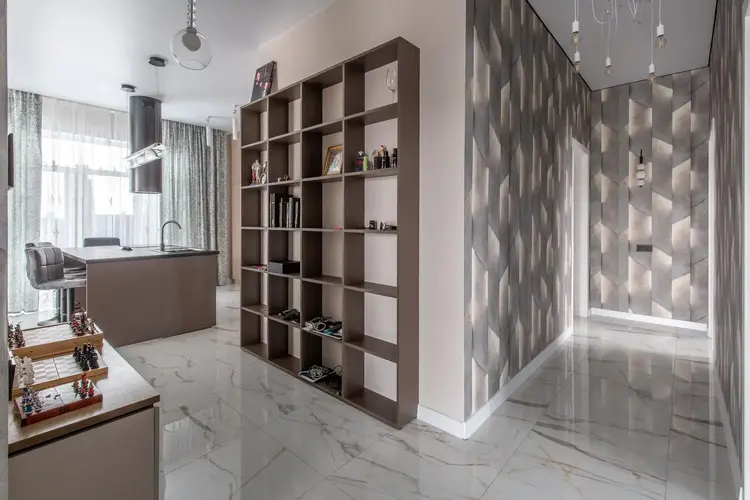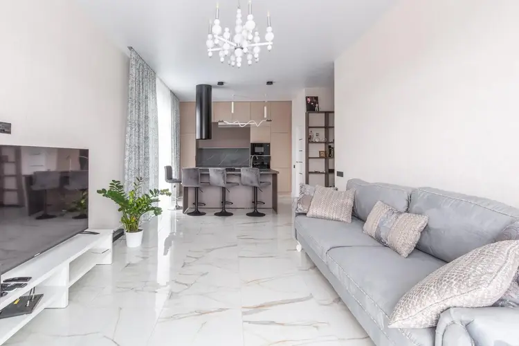 - Потолки: Изысканные натяжные потолки высотой 2,97 метра визуально расширяют пространство, добавляя ощущение простора.