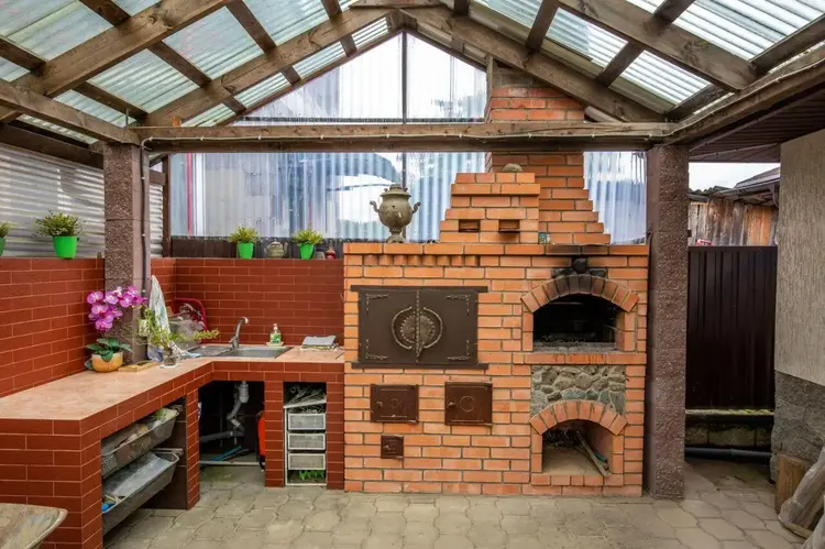 На крытой и вымощенной плиткой площадке устроена летняя зона отдыха с печкой-коптильней, плитой, духовкой, обеденной зоной.