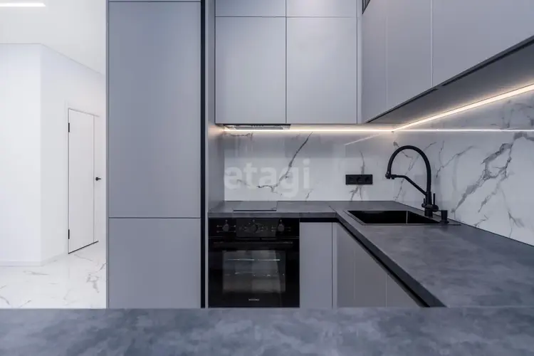 Кухня укомплектована всей необходимой техникой (духовой шкаф, посудомоечная машина, холодильник, вытяжка, варочная поверхность).