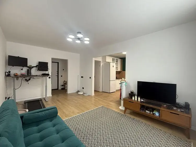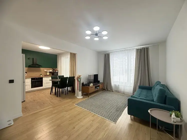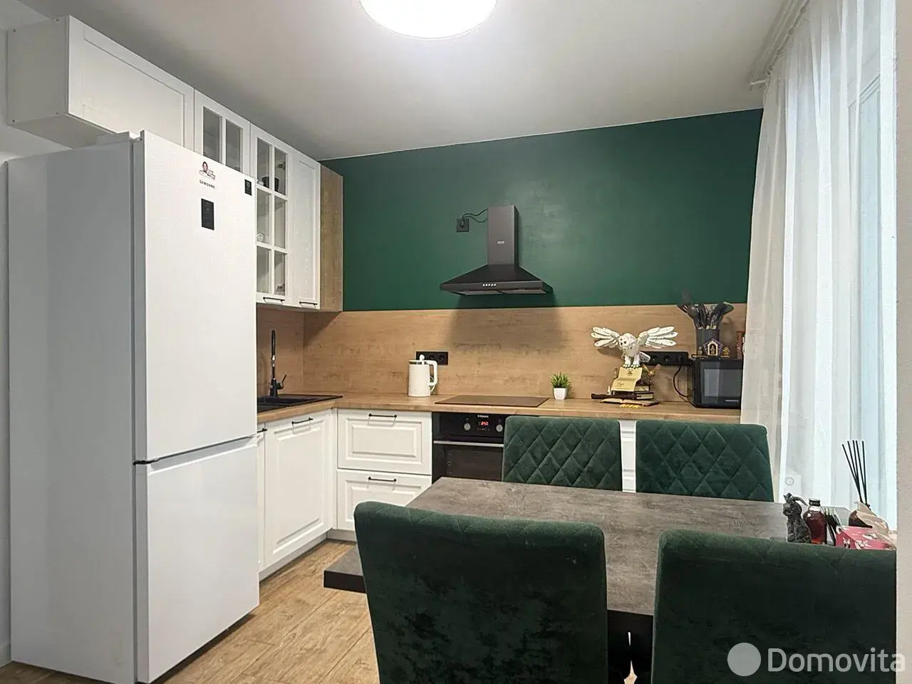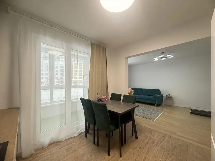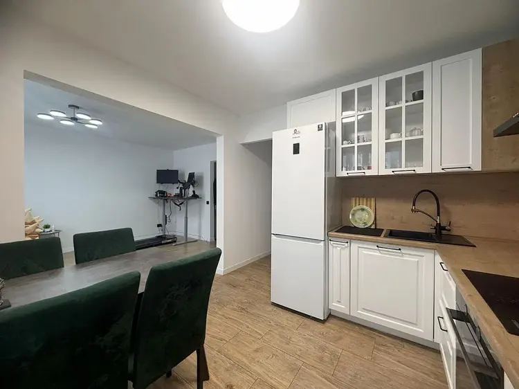 Встроенная кухня с доводчиками и техникой (электрическая варочная поверхность и духовой шкаф Hansa, вытяжка). Смеситель с переключением на питьевую воду. Холодильник Samsung и обеденная группа останутся бонусом новому владельцу.