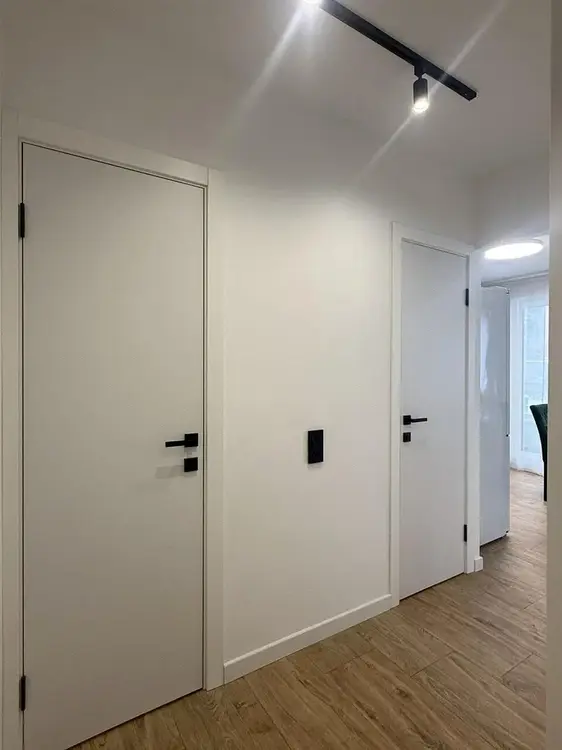 Межкомнатные белые двери с чёрной фурнитурой и магнитными замками.