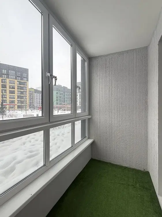 Лоджия застеклена панорамной рамой, окна выходят в замечательный закрытый двор.