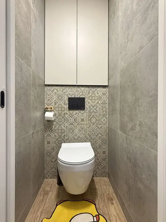 Раздельный санузел облицован плиткой, установлена инсталляция с подвесным унитазом, подвесная тумба со столешницей и накладной раковиной, акриловая ванна, современные смесители, зеркало, стиральная машинка Samsung, принудительная вентиляция.