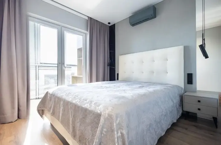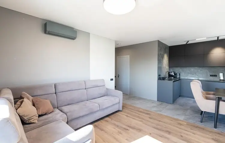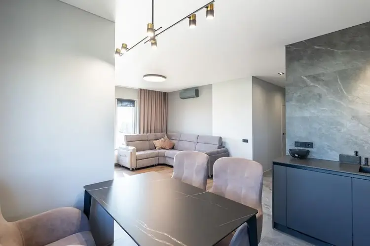 Ремонт выполнен из материалов импортного производства. На полу уложен широкоформатный керамогранит. Стены выровнены, нанесена декоративная штукатурка. В отделке санузла использована качественная плитка. Итальянская сантехника, подвесной унитаз с инсталляцией. Выполненная на заказ душевая из каленого стекла. Установлены стеклопакеты с профилем из ПВХ. Панорамное остекление.