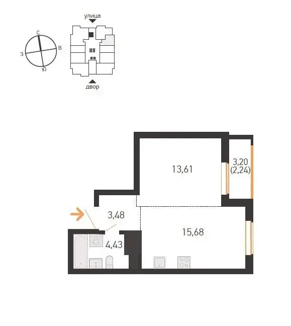 Свободная планировка позволяет организовать спальню (13.кв.м) и жилую с кухонным оборудованием (15,6 кв.м.), что преобразит квартиру в формат «евро двухкомнатной».