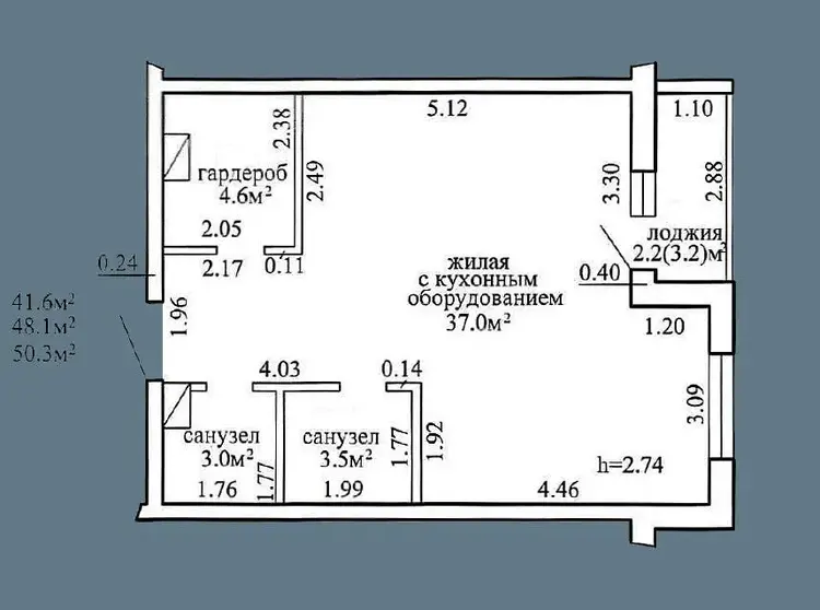 - Площадь: общая 46.7 м2 / жилая 35.1 м2