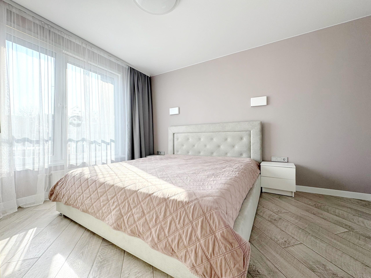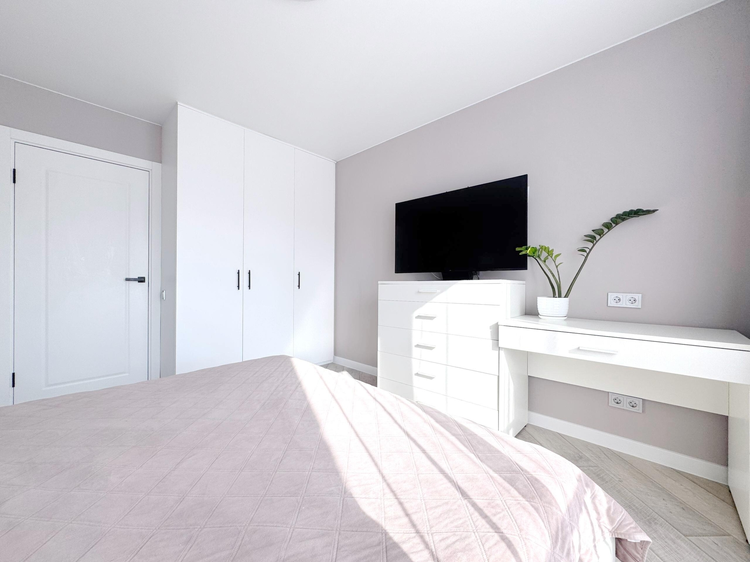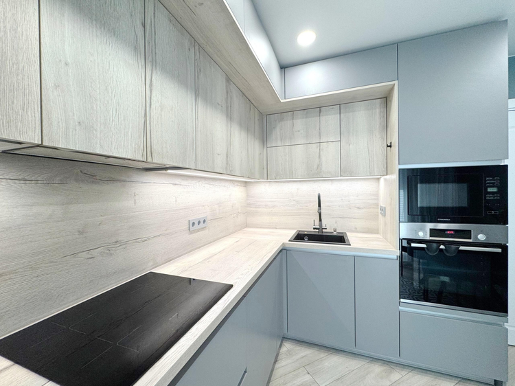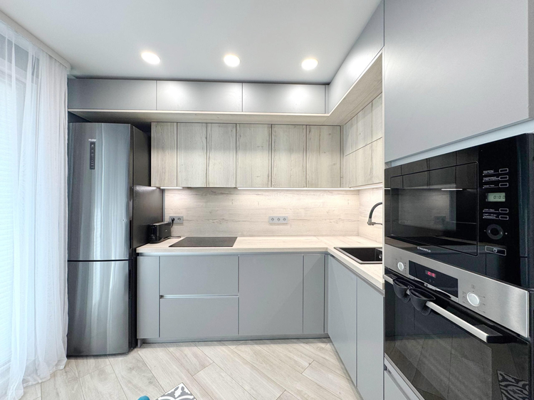 · Кухня премиум-класса: Гарнитур с фасадами Egger и механизмами Blum. Техника: индукционная панель Bosch, духовой шкаф Bosch, посудомоечная машина Siemens, микроволновка Maunfeld и холодильник Hailer.