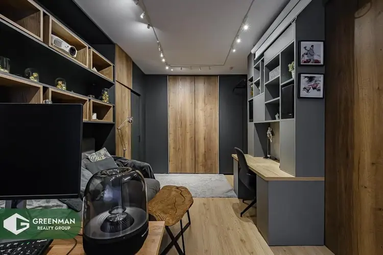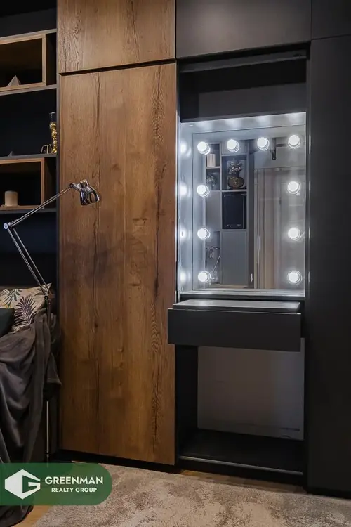 В основной комнате установлено обилие мест хранения + удобное место для make-up (женская половинка оценит) и рабочие зоны. Так же как и в кухне, в шкафах установлена автоматическая подсветка, что позволяет утром не беспокоить вторую половинку.
