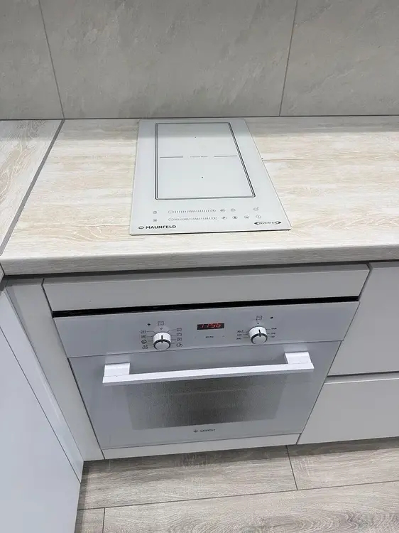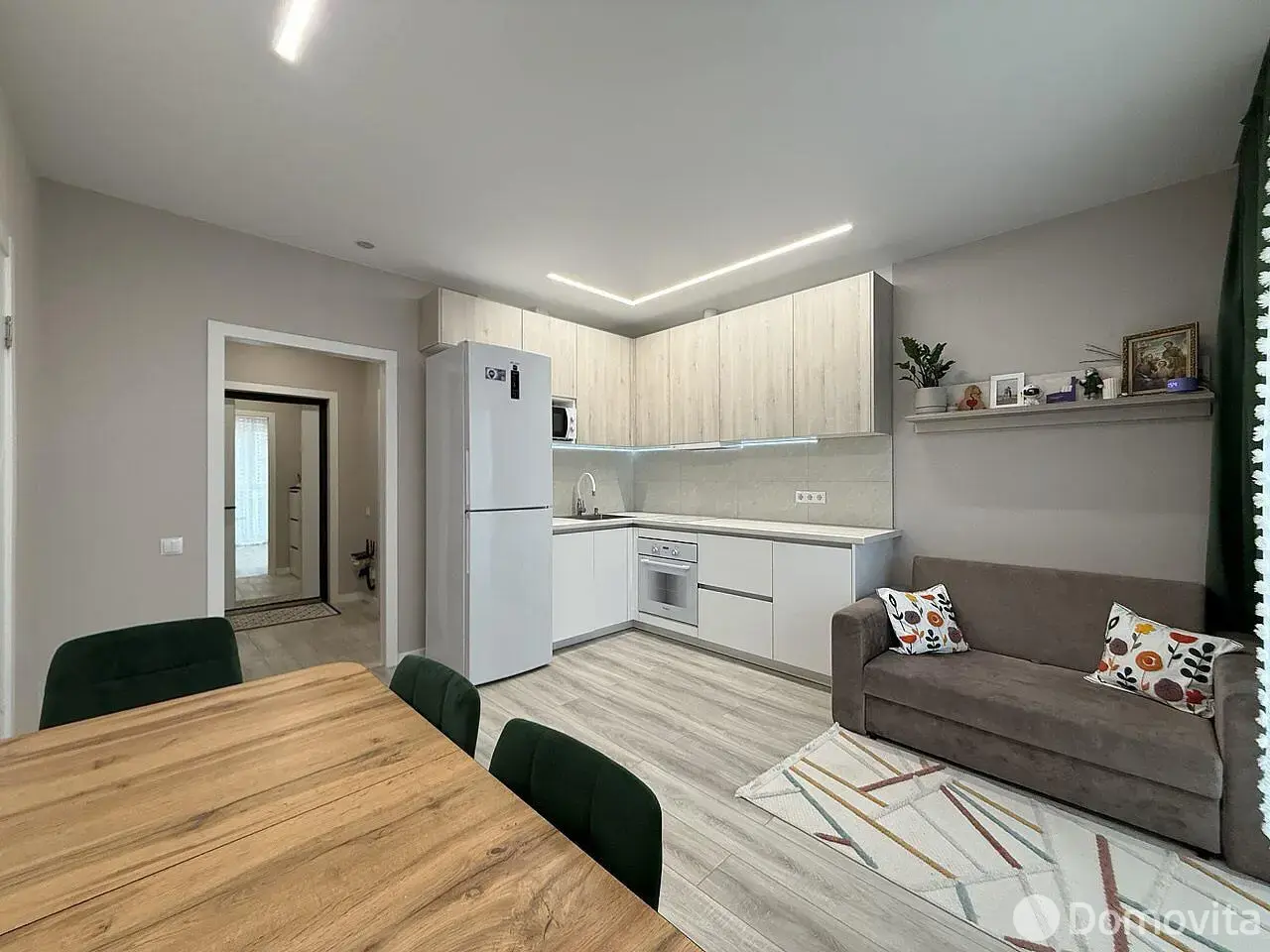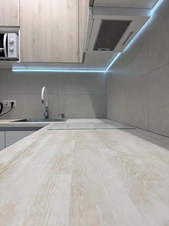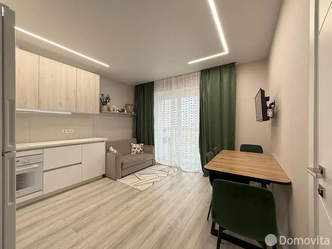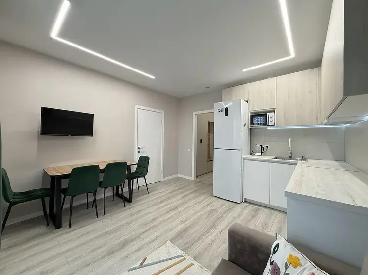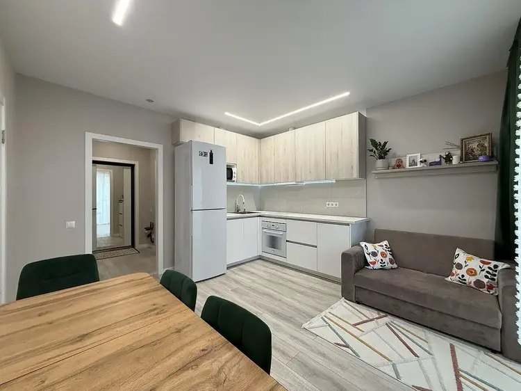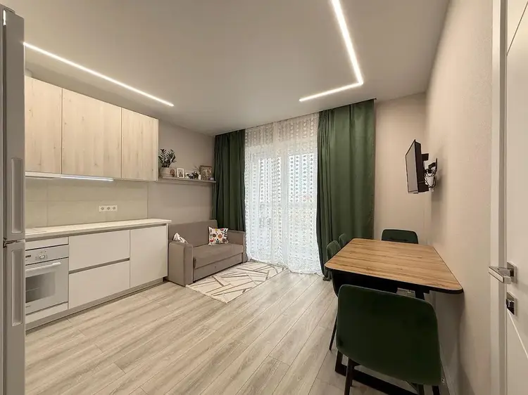 Встроенная кухня с доводчиками Blum, подсветкой рабочей зоны и техникой (индукционная варочная поверхность, духовой шкаф, вытяжка, посудомоечная машинка и холодильник). Гостиная оснащена стильной обеденной группой, диваном со спальным местом и телевизором. Панорамный выход на лоджию, которая застеклена в пол и имеет дополнительное хранение в виде шкафа.